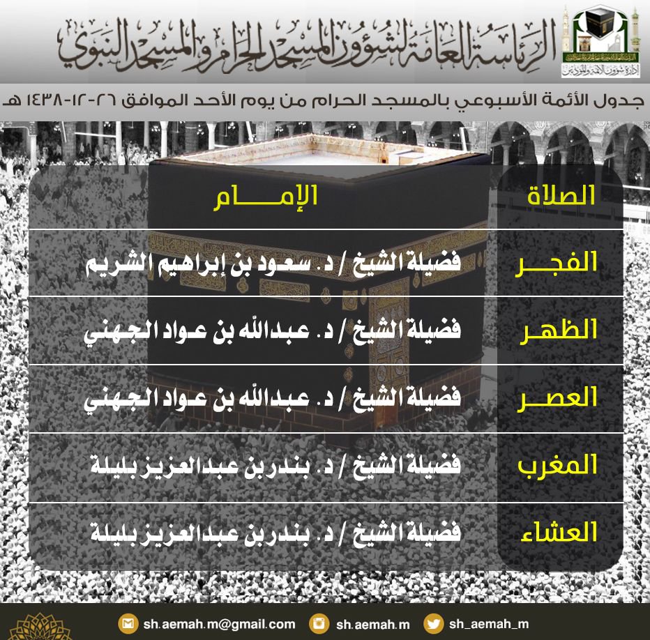 الرئاسة العامة لشؤون المسجد الحرام والمسجد النبوي عن جدول الائمة الأسبوعي للمسجد الحرام صحيفة بناء الالكترونية