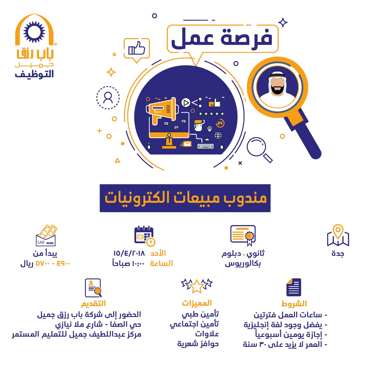 وظائف في جدة عن طريق باب رزق جميل كاشير ومندوبي مبيعات الكترونية